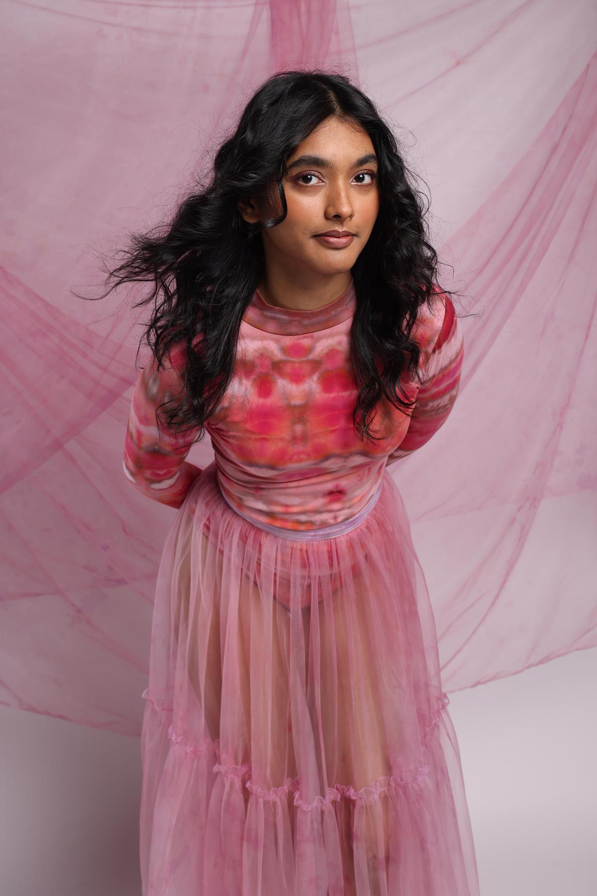 Long-sleeve Knitted bodysuit with a soft, breathable texture. Designed with a high neckline, fitted shape, and snap-button closure at the base. Hand-dyed in Sunset Sky pink and After Rain Golden Hour tones, creating a smooth gradient finish with natural variation across each piece.