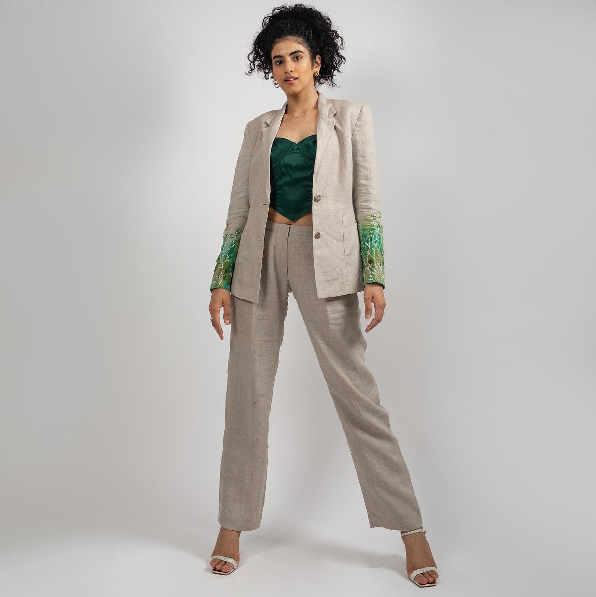 Clean. Crisp. Commanding. The Ice Creeper Blazer is a study in cool elegance. Crafted from pure linen, this longline blazer is elevated by delicate hand embroidery on the sleeves, giving it a subtle edge without overpowering its minimal charm.