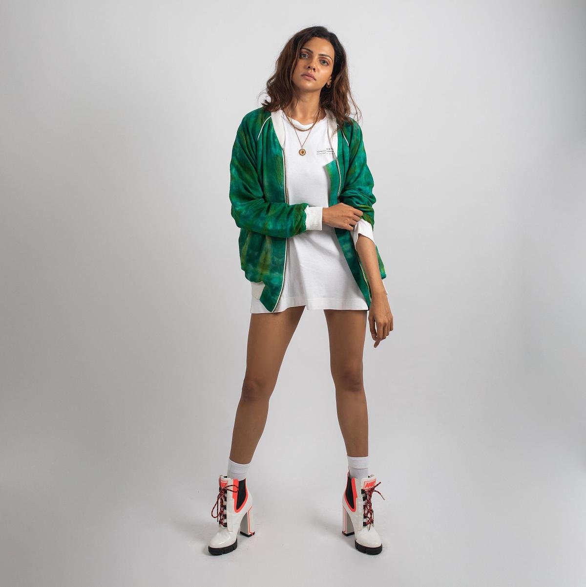 The soft green hue is accented with crisp white piping, a sturdy metal zip, and functional pockets that balance form with utility. Designed with a roomy silhouette and clean lines, this bomber jacket brings together relaxed elegance and urban polish — ideal for workday layering or off-duty statements.